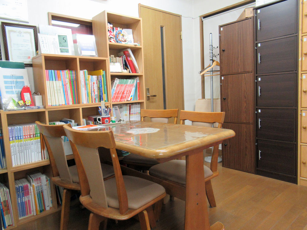 質問があるときや確認テストの答え合わせは、コミュニケーションテーブルでマンツーマンで行います。教室内で会話するとブースで自分の授業に集中している子の気が散ってしまうことがあるからです。